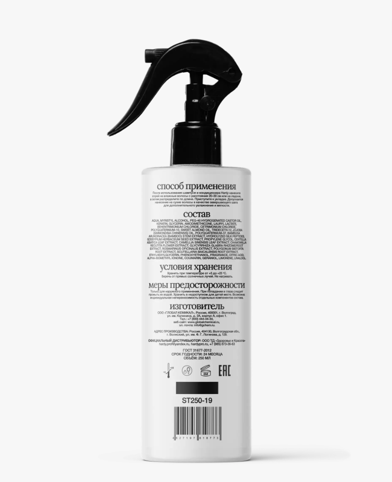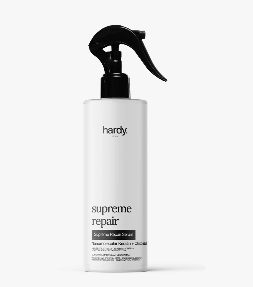 Применение: После использования шампуня и кондиционера Hardy, нанесите спрей на влажные волосы с расстояния 20-30 см или на ладони. Приступите к укладке. Допускается нанесение на сухие волосы в качестве завершающего шага для дополнительного увлажнения и мягкости.